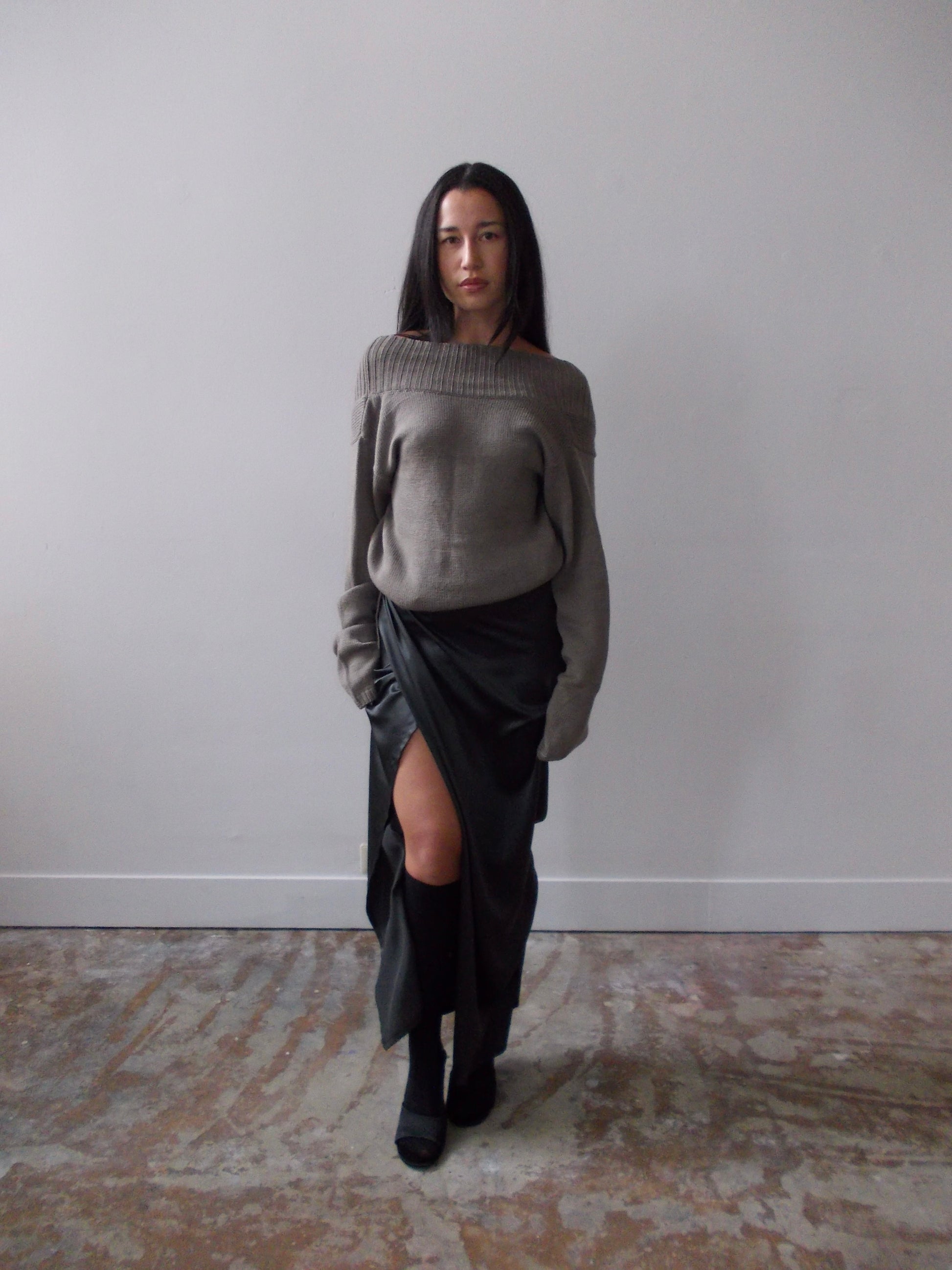 An ankle-length wrap skirt crafted from smooth, pre-dyed black satin silk. The one-size design allows for effortless adjustment, combining a flattering fit with elegant, fluid movement.