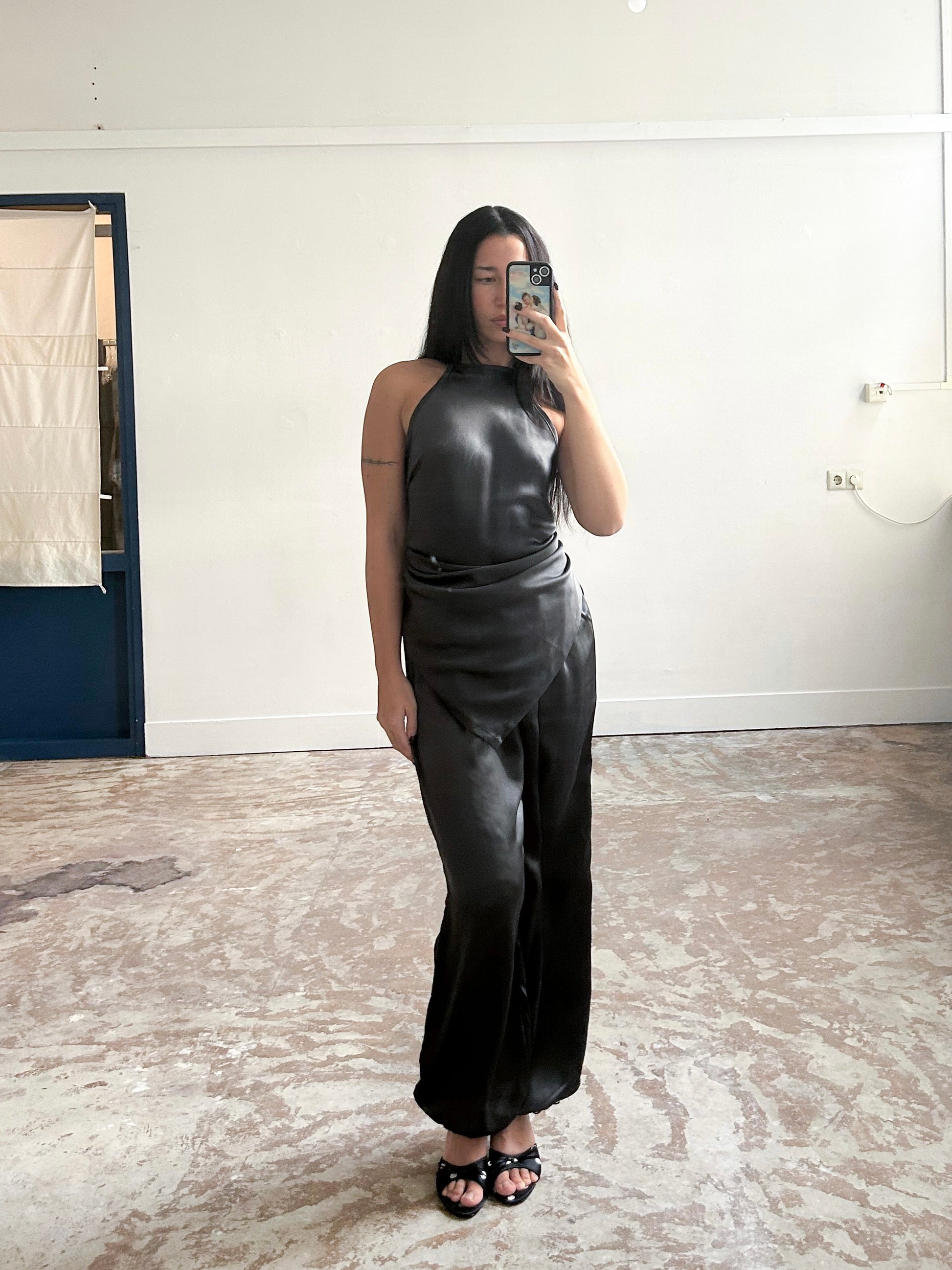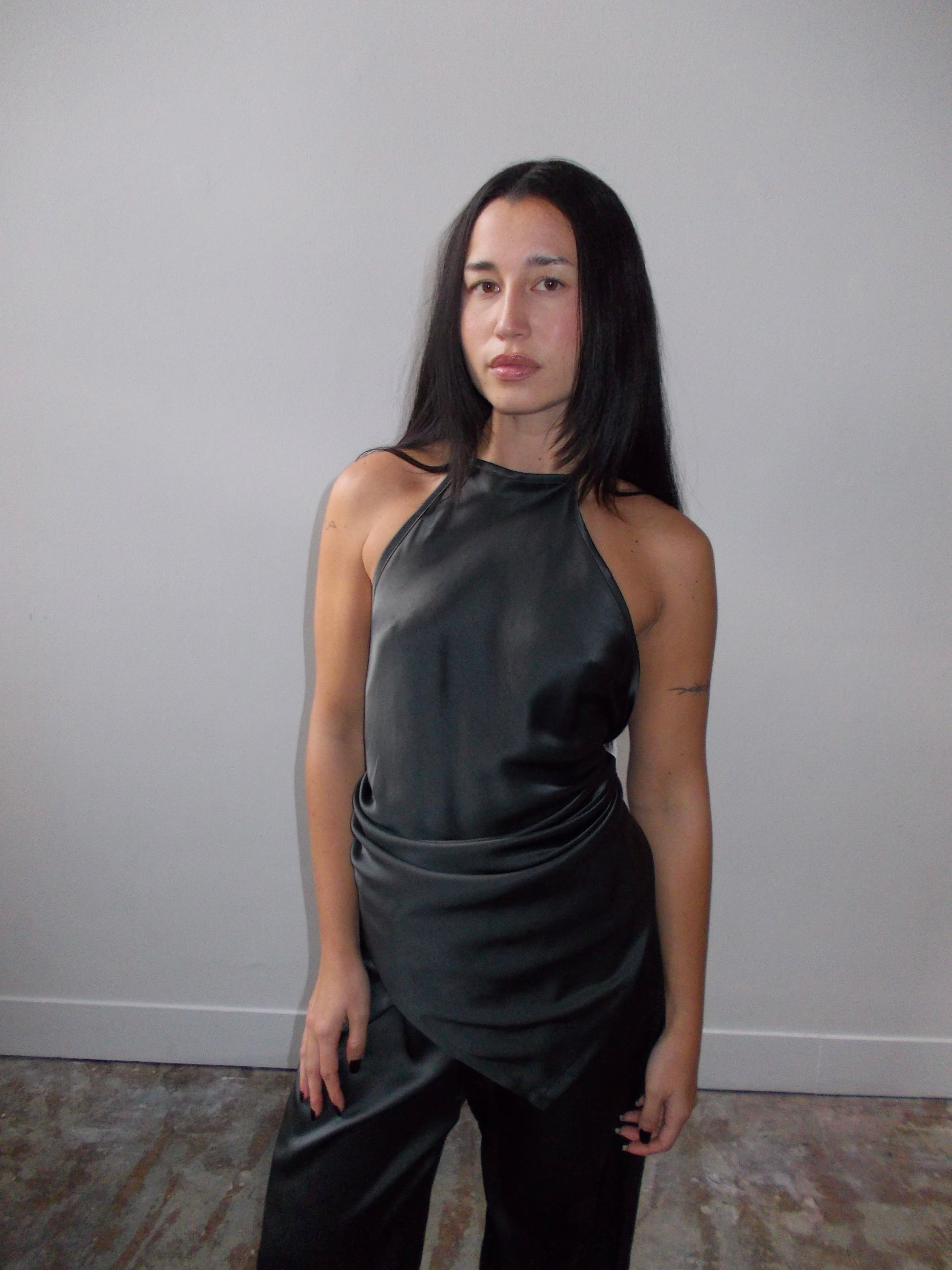 A sleek, sexy top crafted from pre-dyed black satin silk, featuring a high neckline and an open back for an elegant, daring silhouette. Adjustable straps allow for a personalized fit and versatile styling.