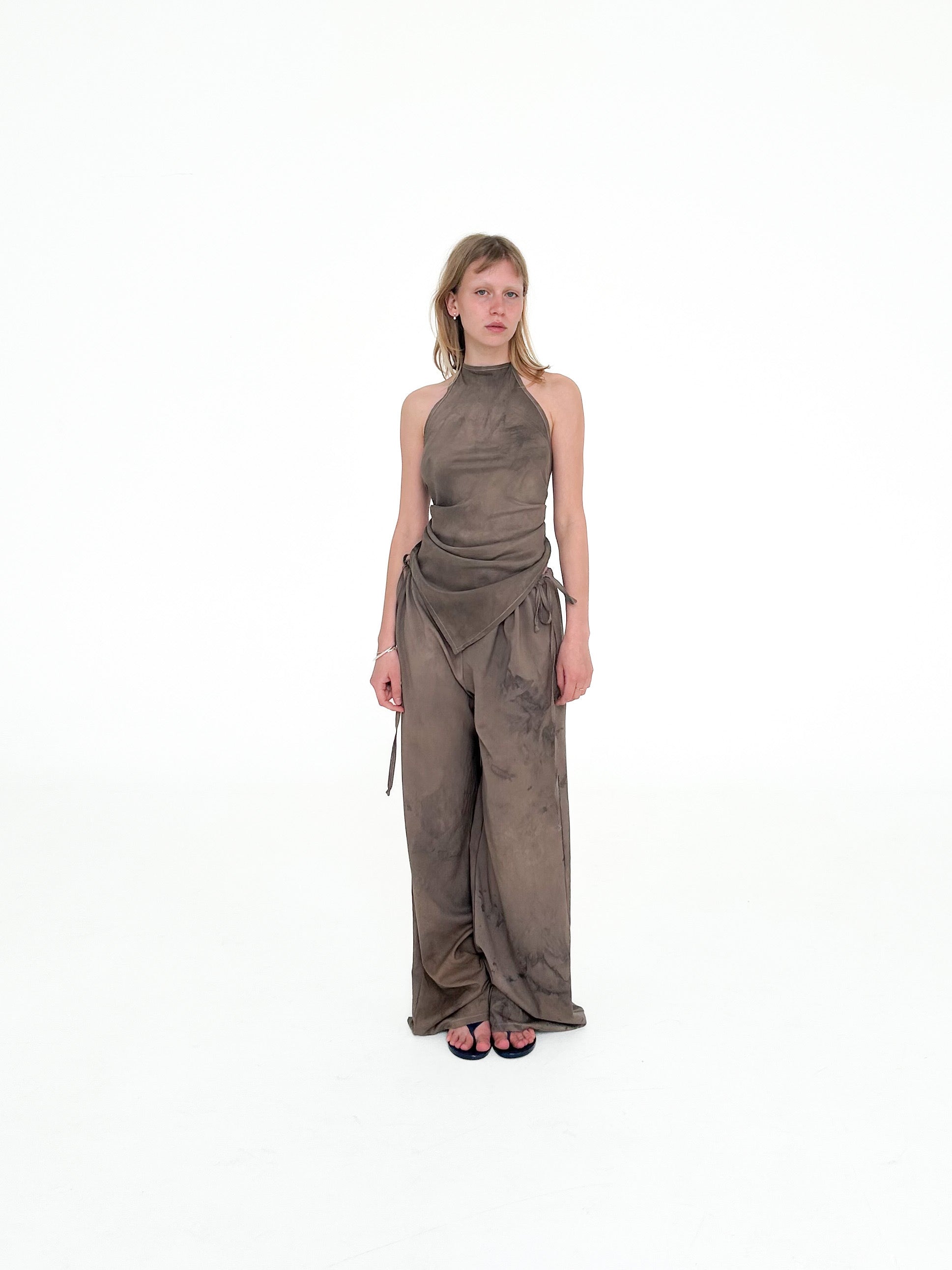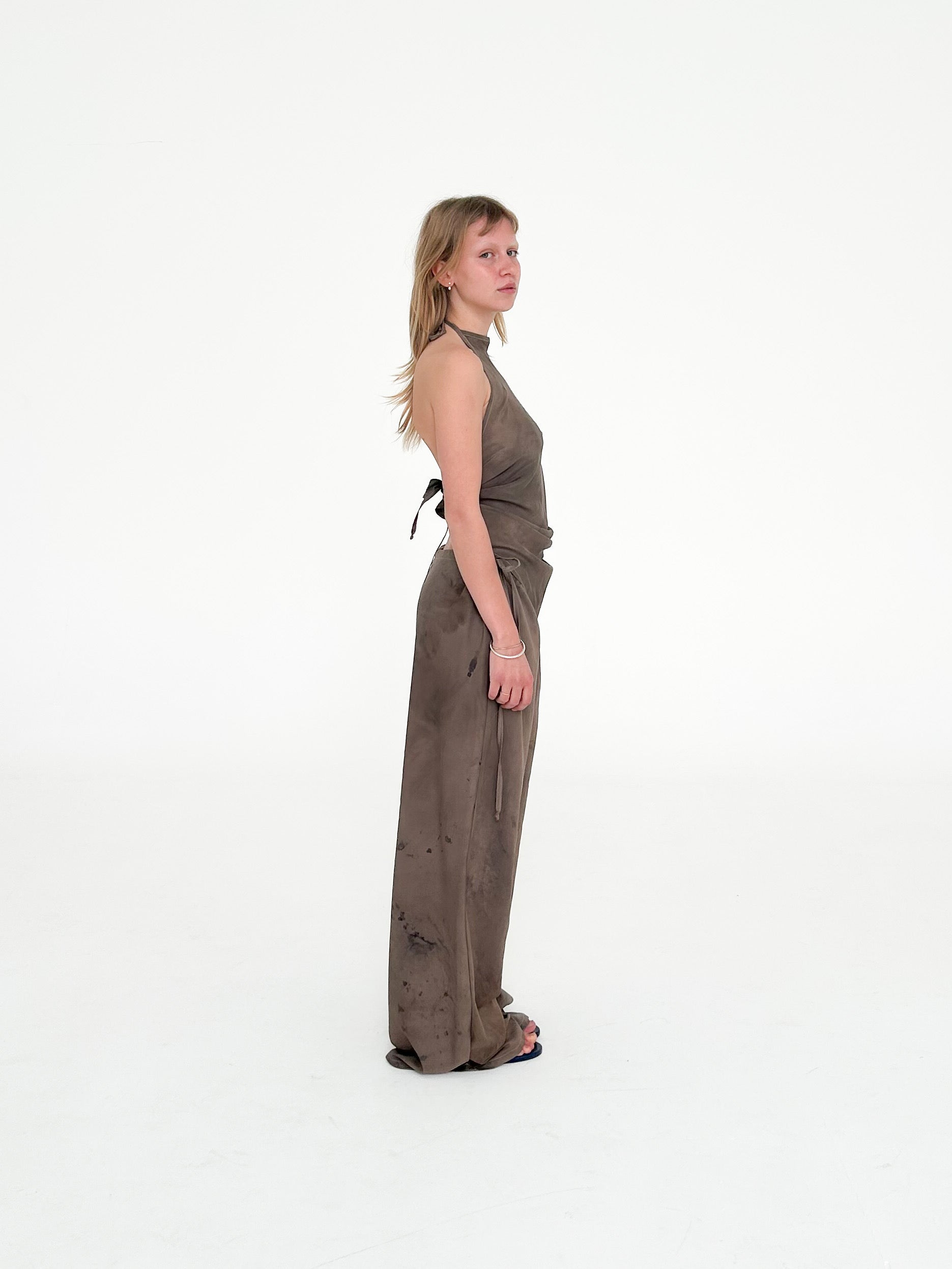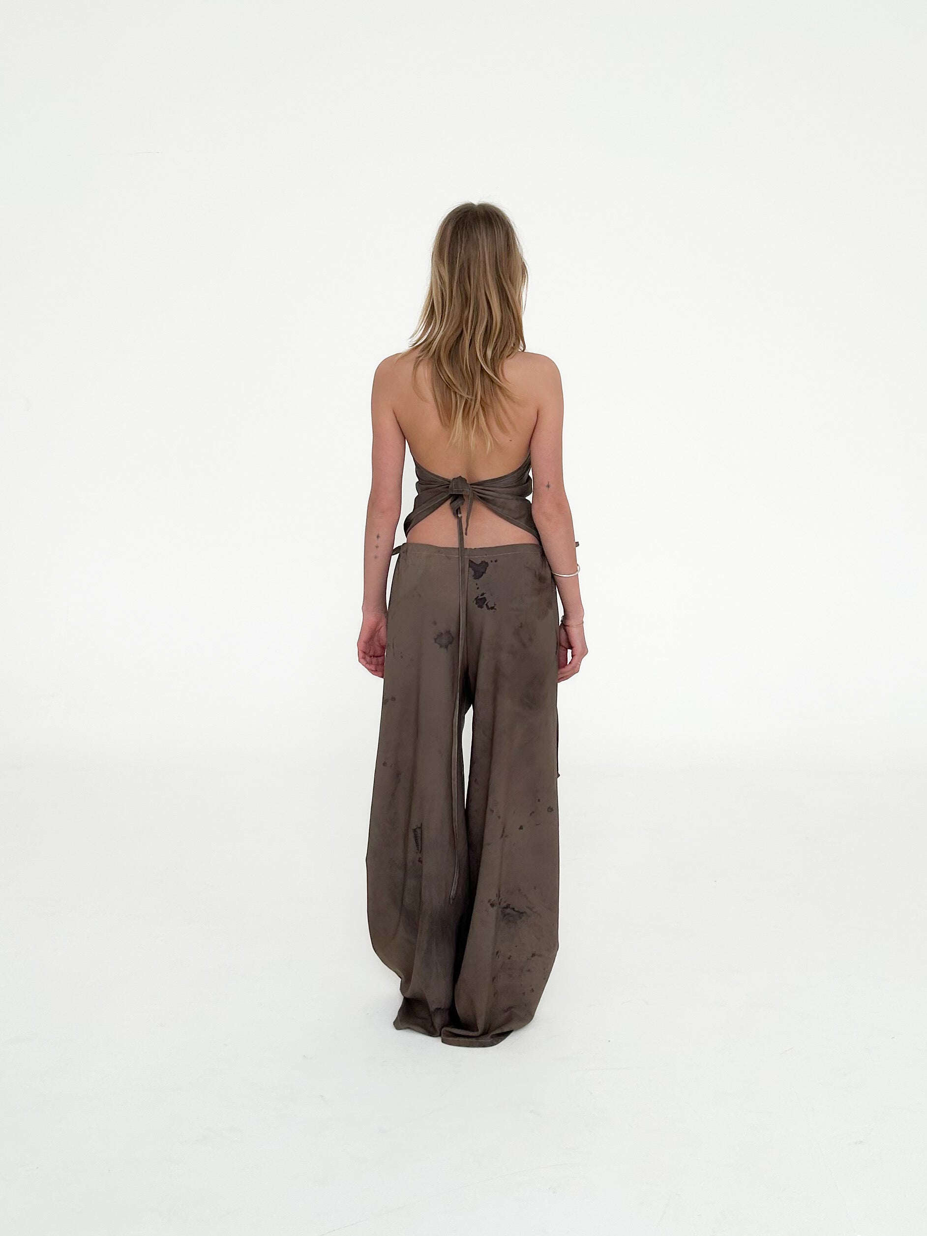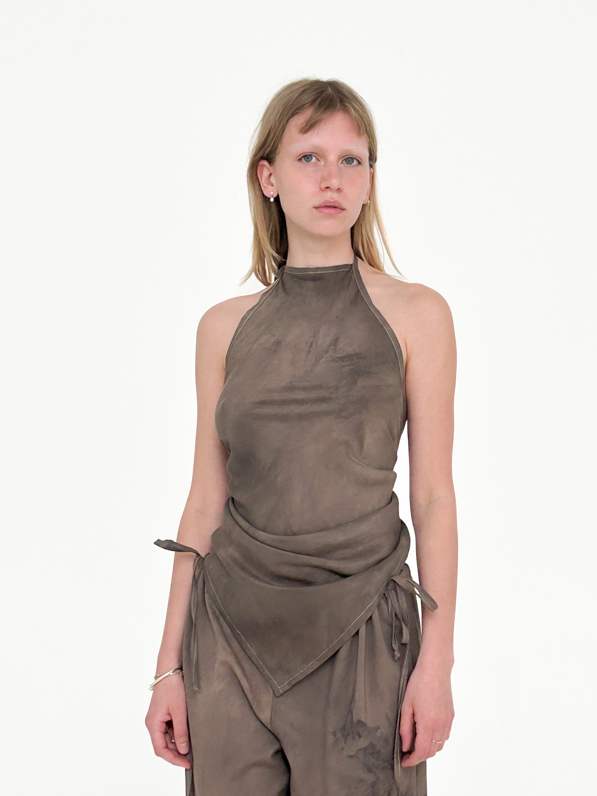 Silk halter top with neck and low back ties, featuring adjustable straps for versatile styling options. Can be worn in multiple ways to suit your look.