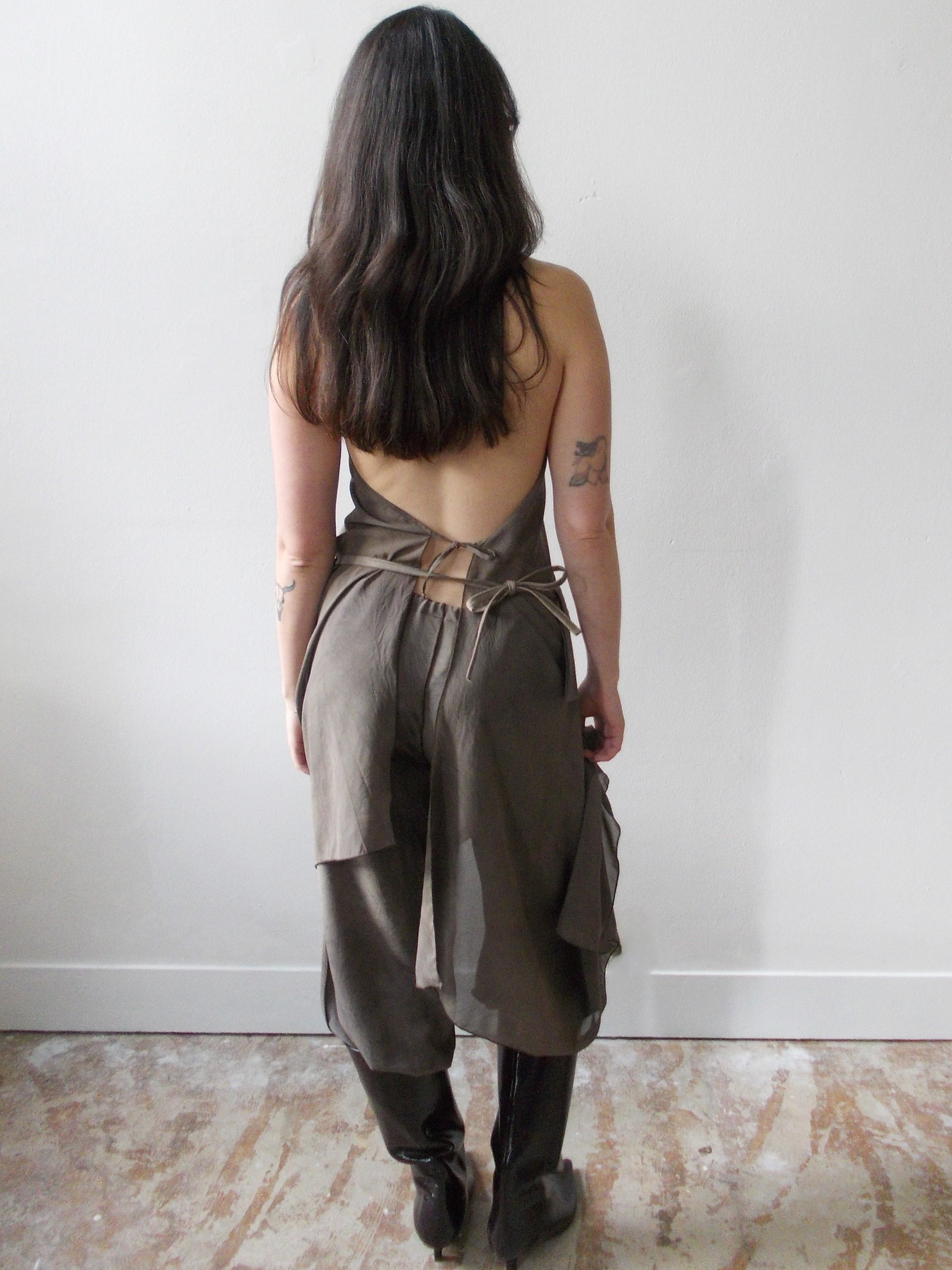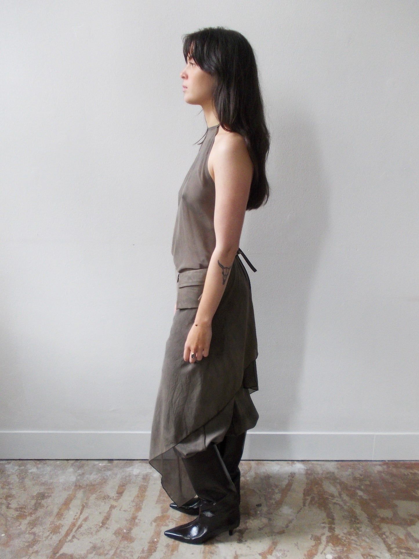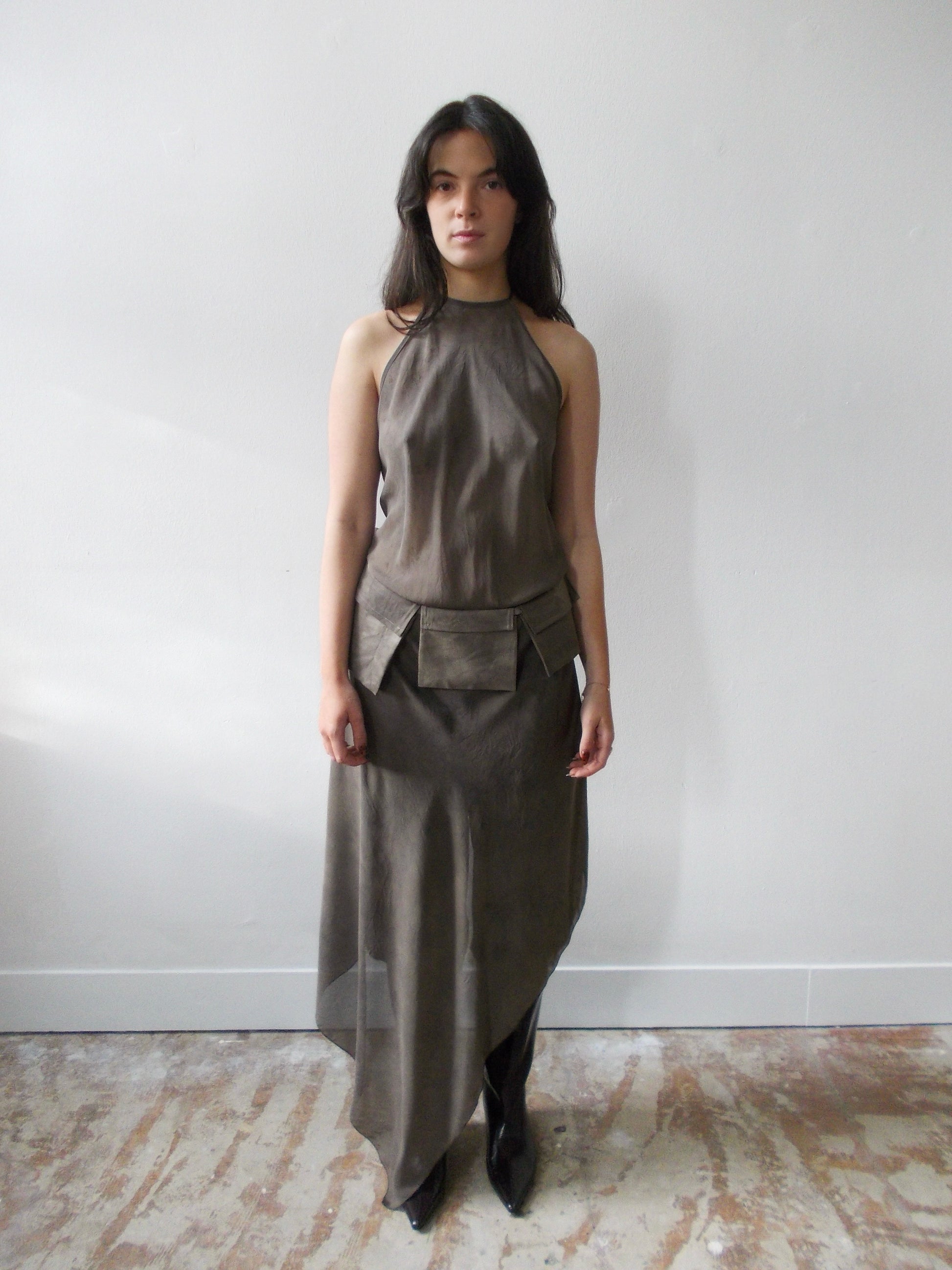 Halter dress made of silk crepe with a tie closure on the back. the dress is asymmetric and can be worn in various ways.