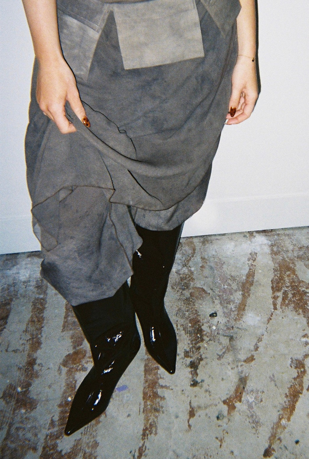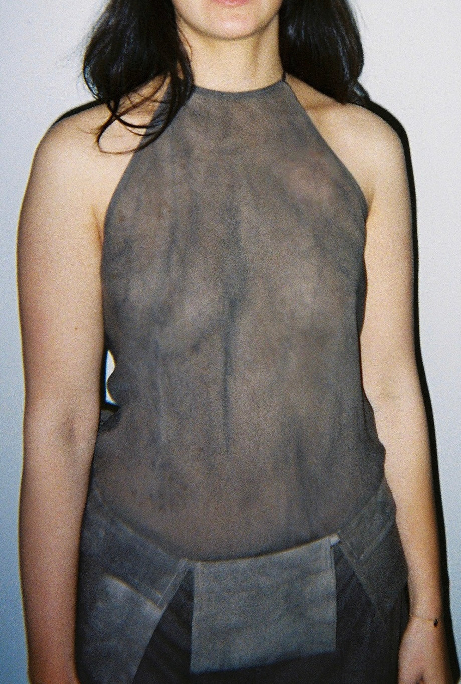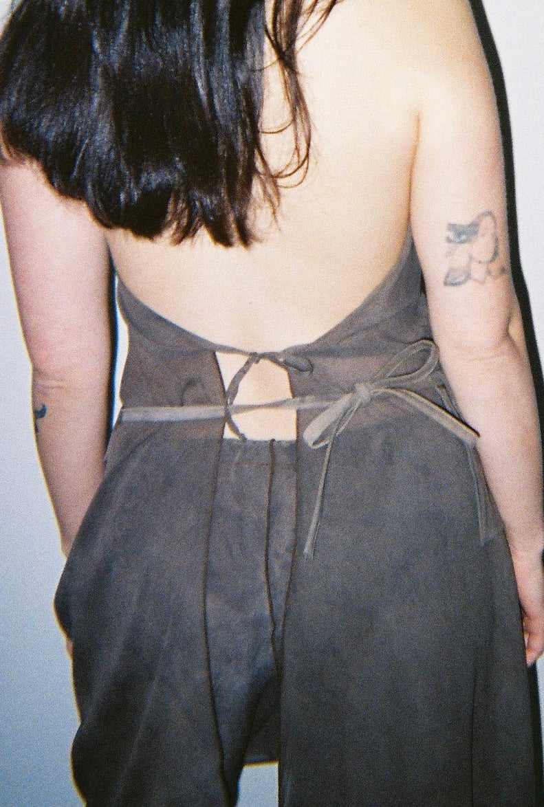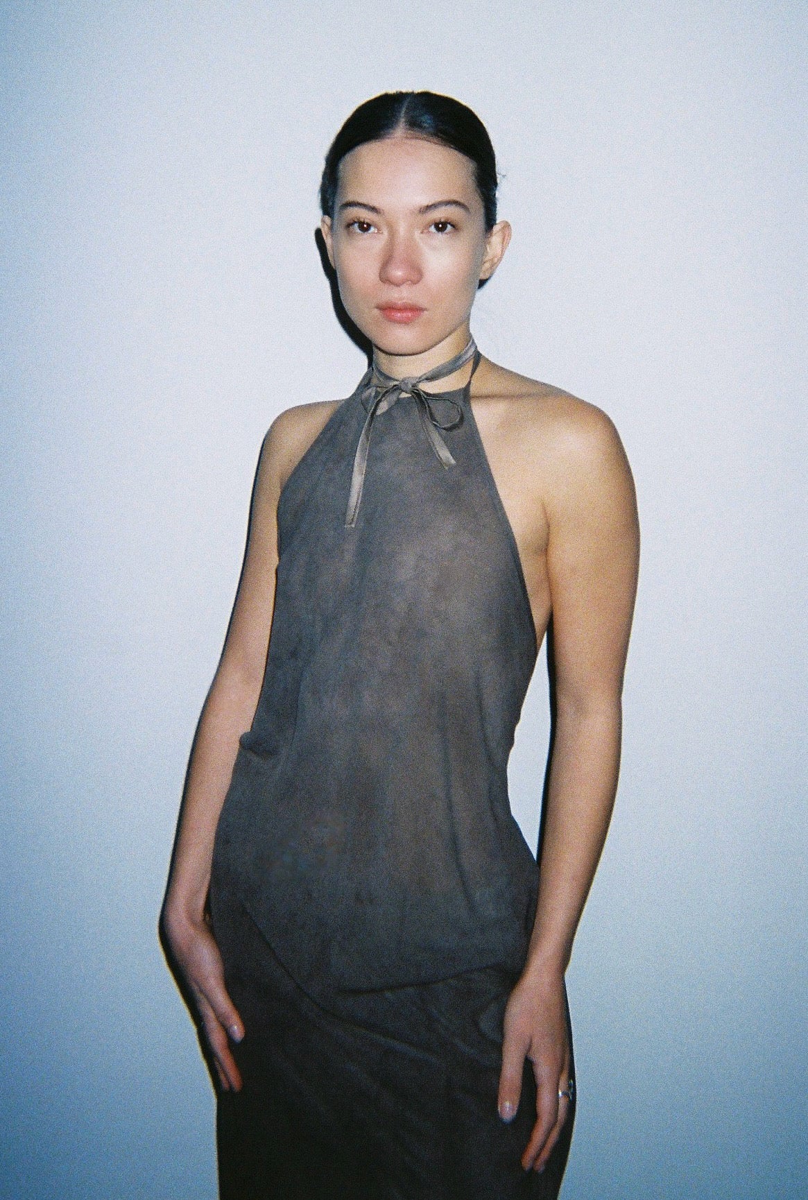 Halter dress made of silk crepe with a tie closure on the back. the dress is asymmetric and can be worn in various ways.