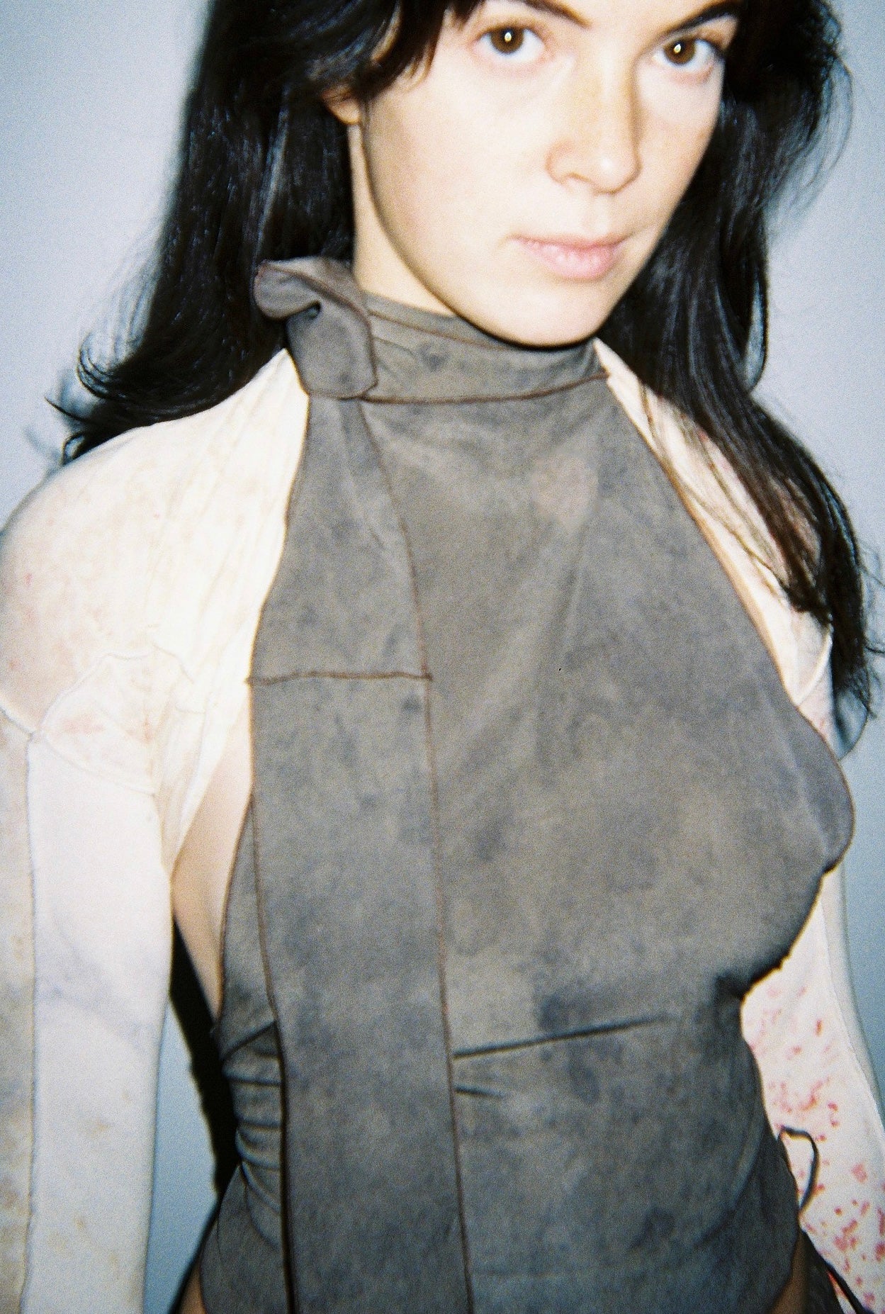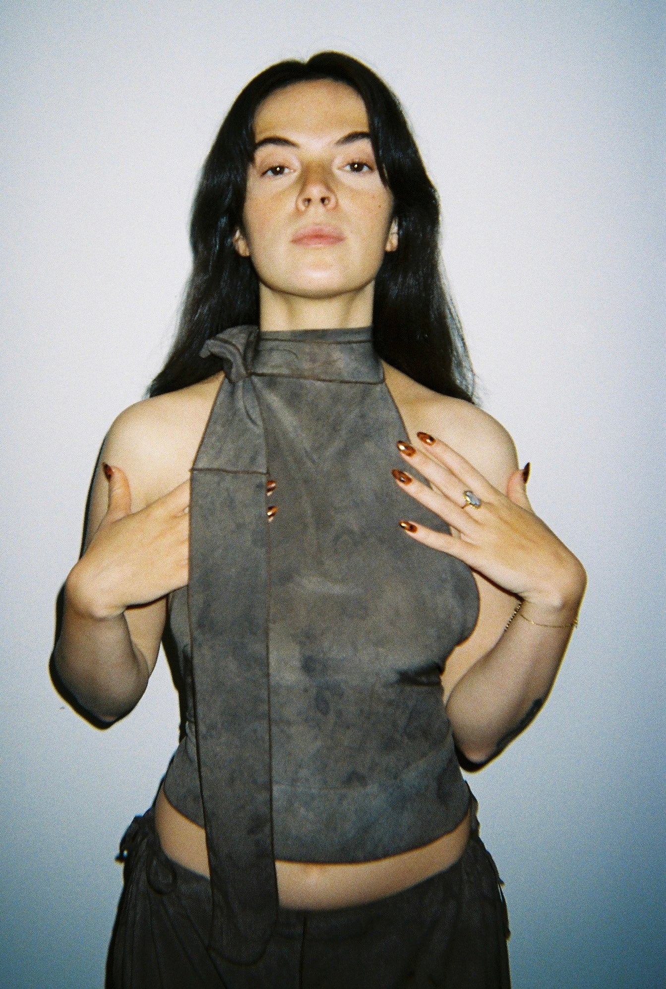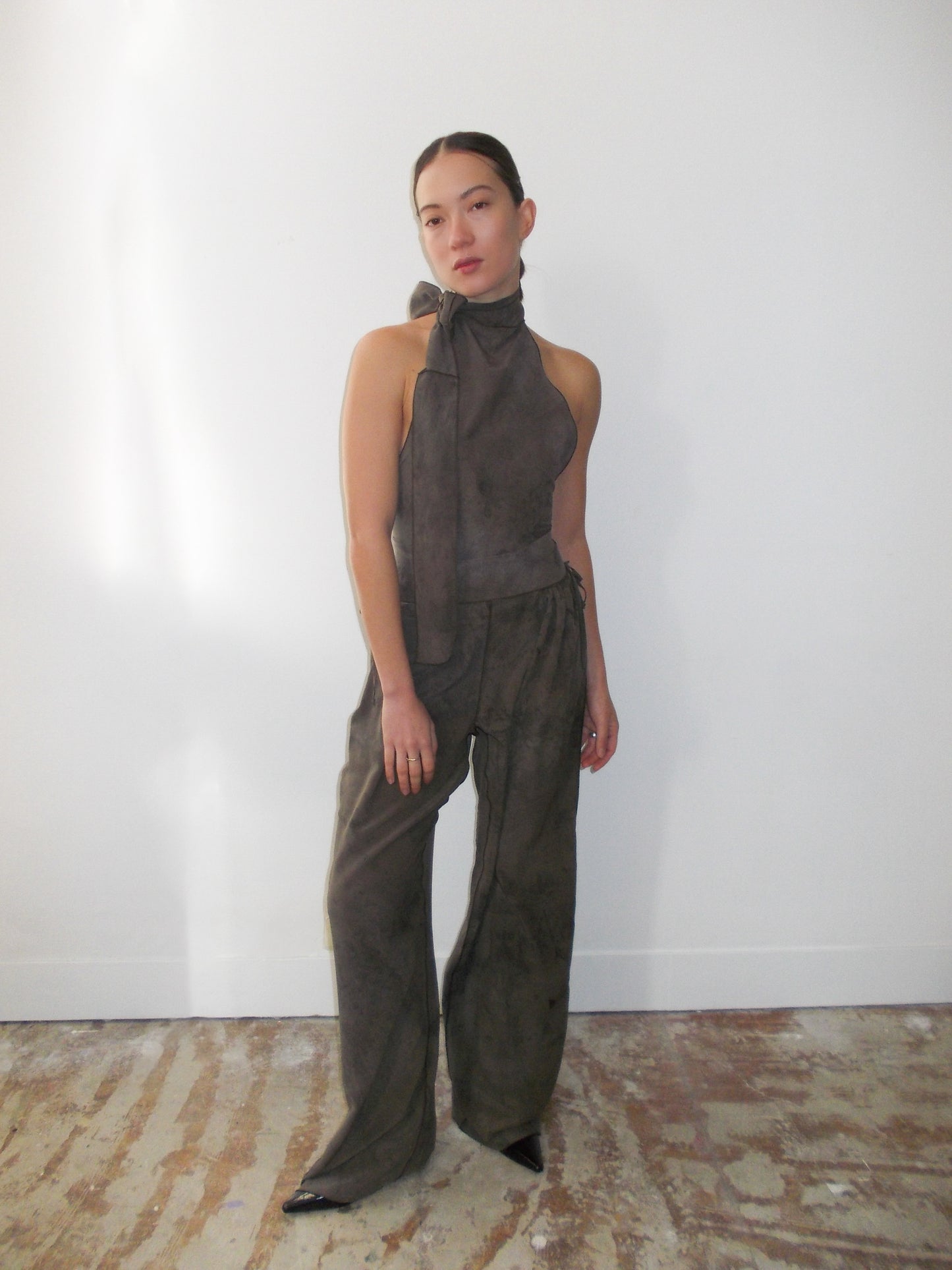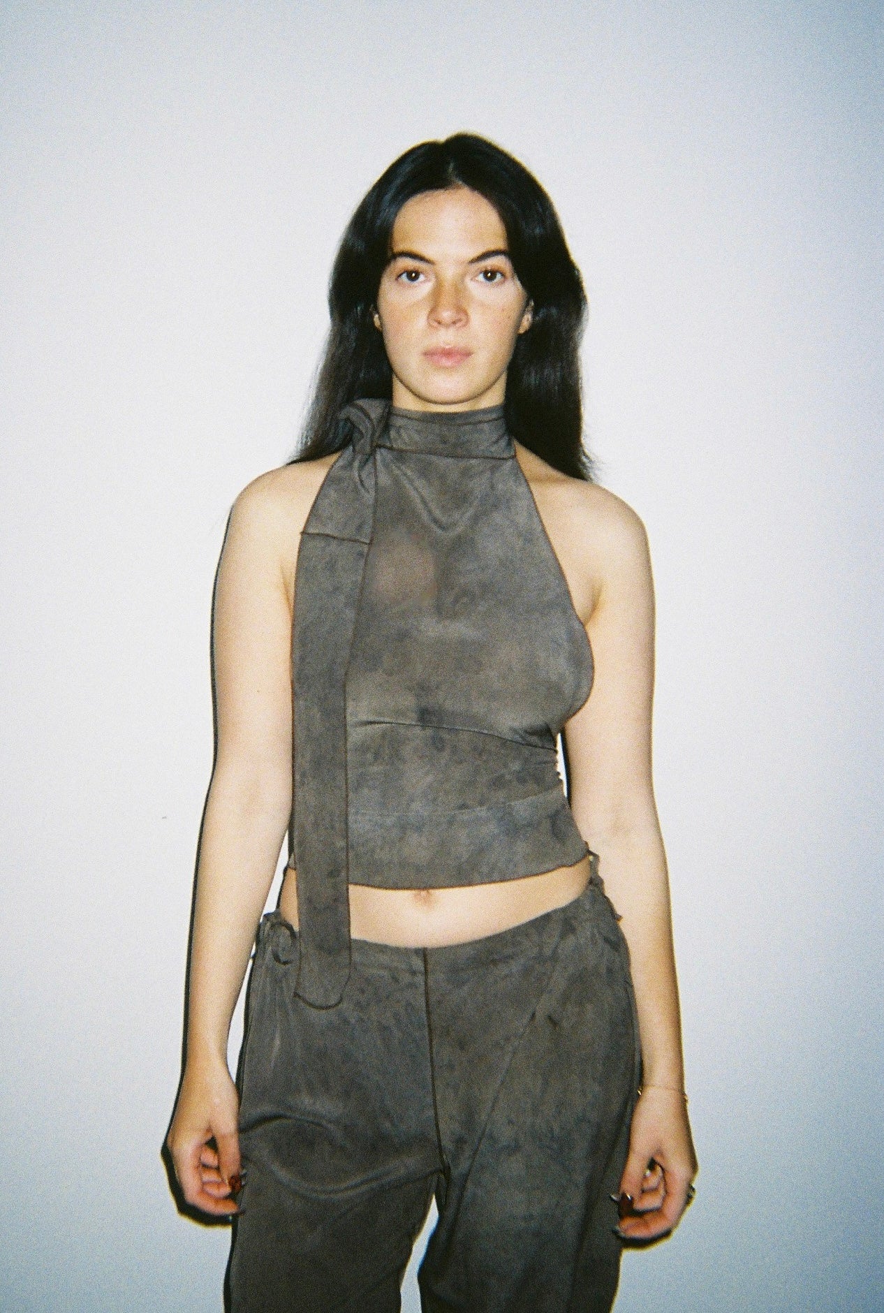 Halter top with scarf strap. This top has a adjustable fit. The back is open and can be tied as per your liking. Visible matching stitching on the outside.