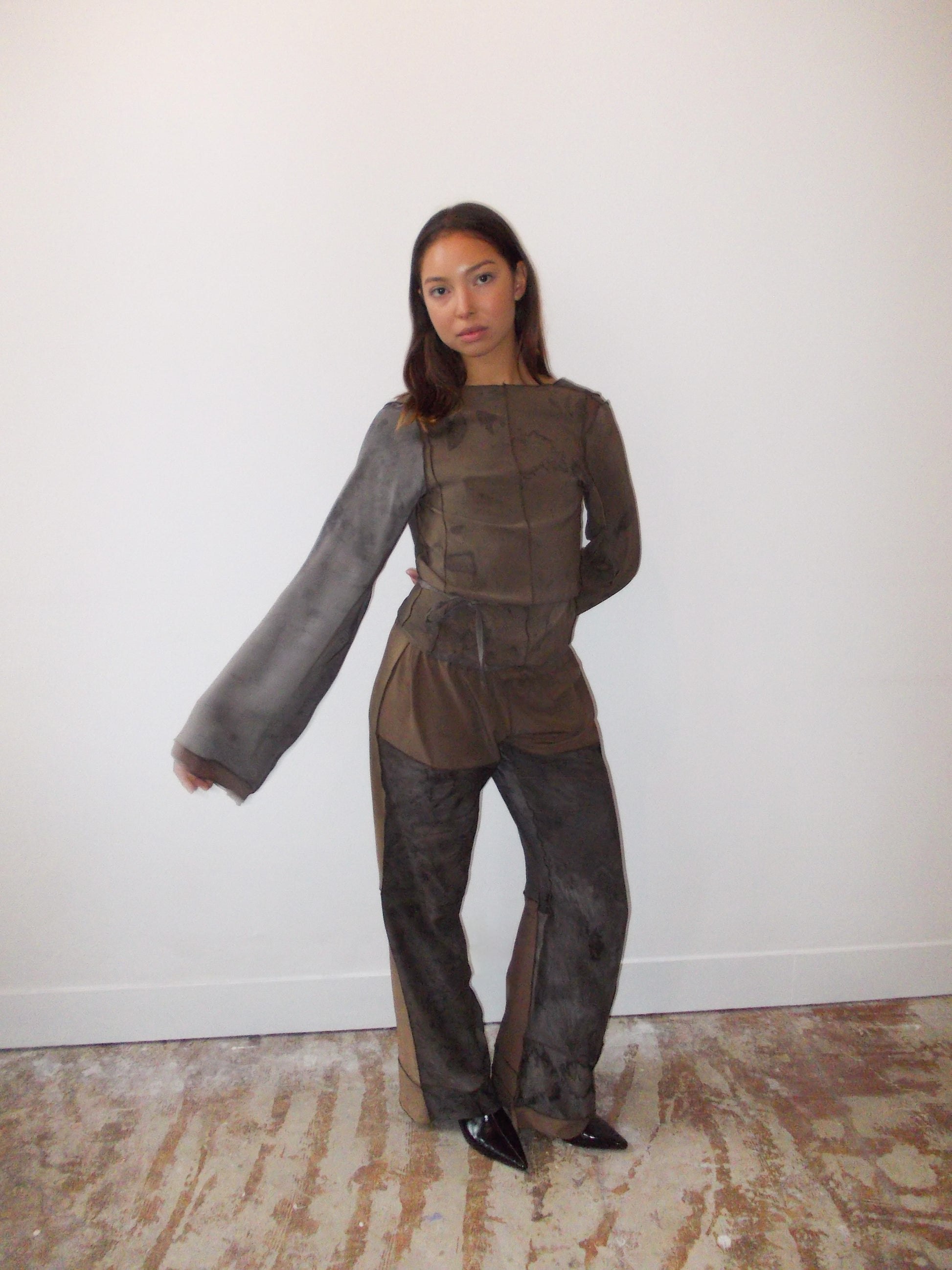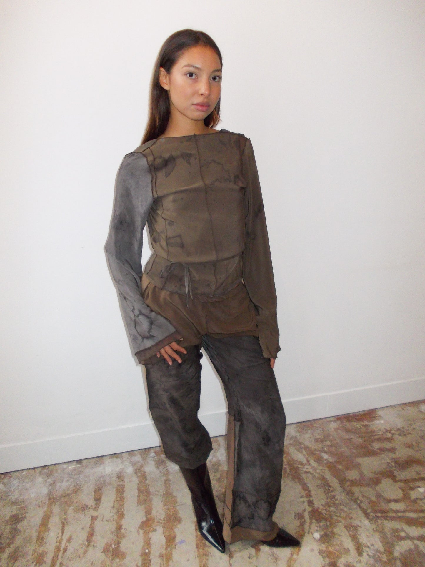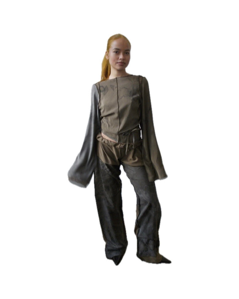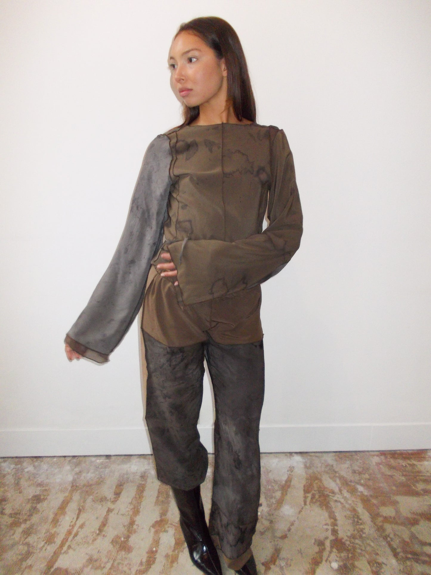 Straight pants made of woven silk crêpe with elasticated waist. Hand dyed in pink, green, brown and yellow hues on a cream base, with a bundle dye technique.