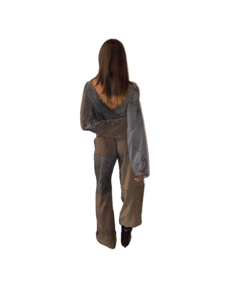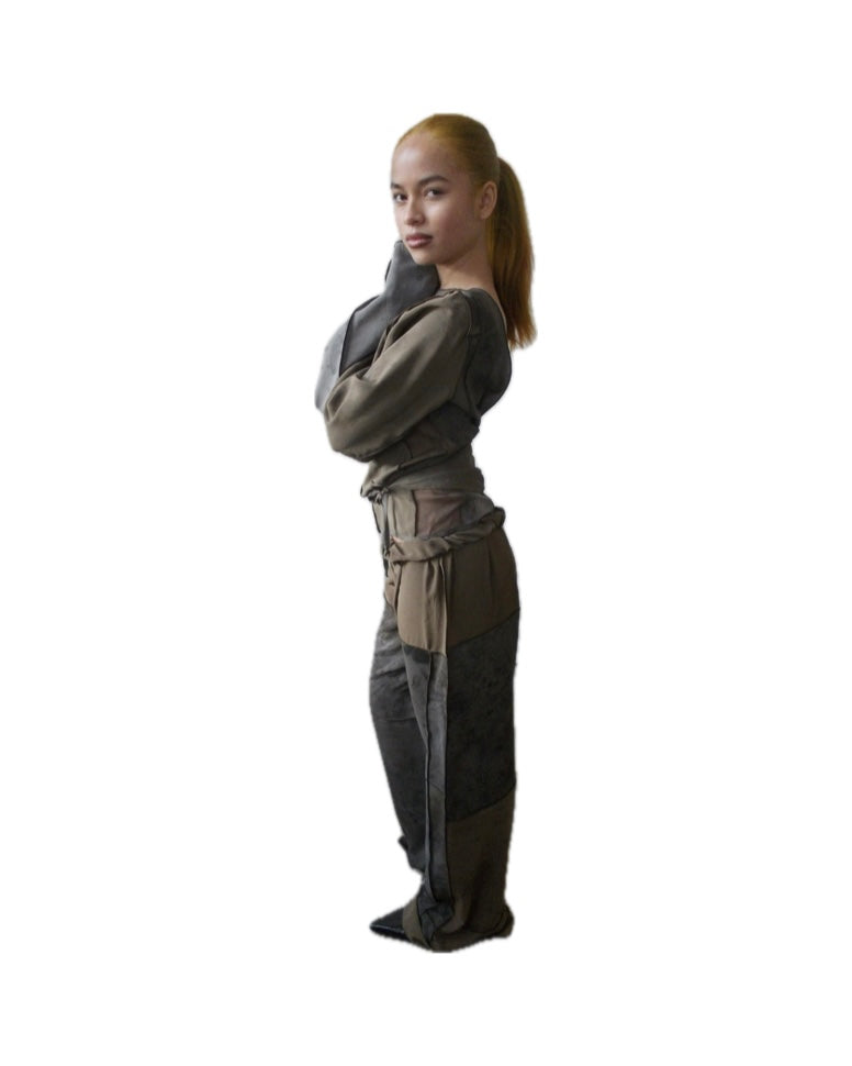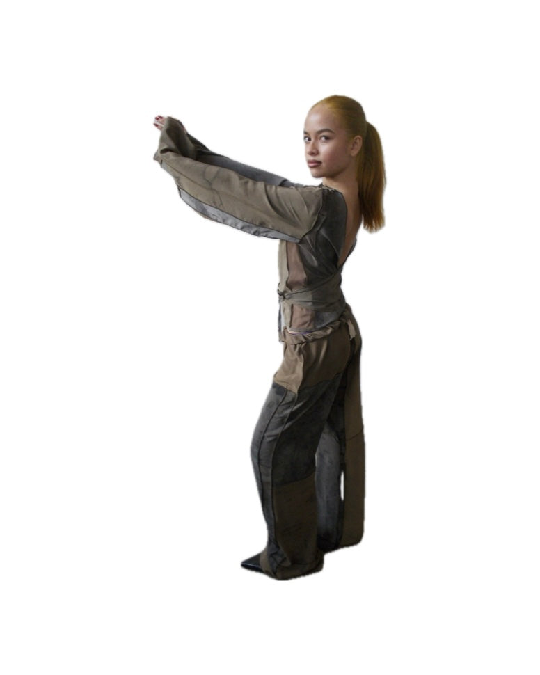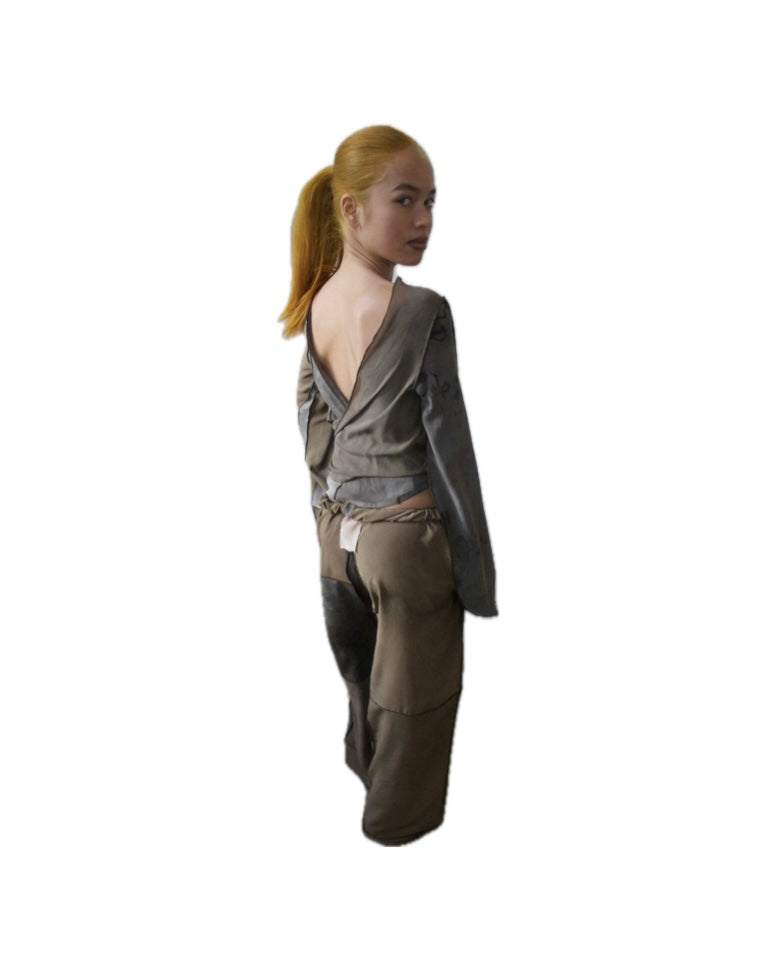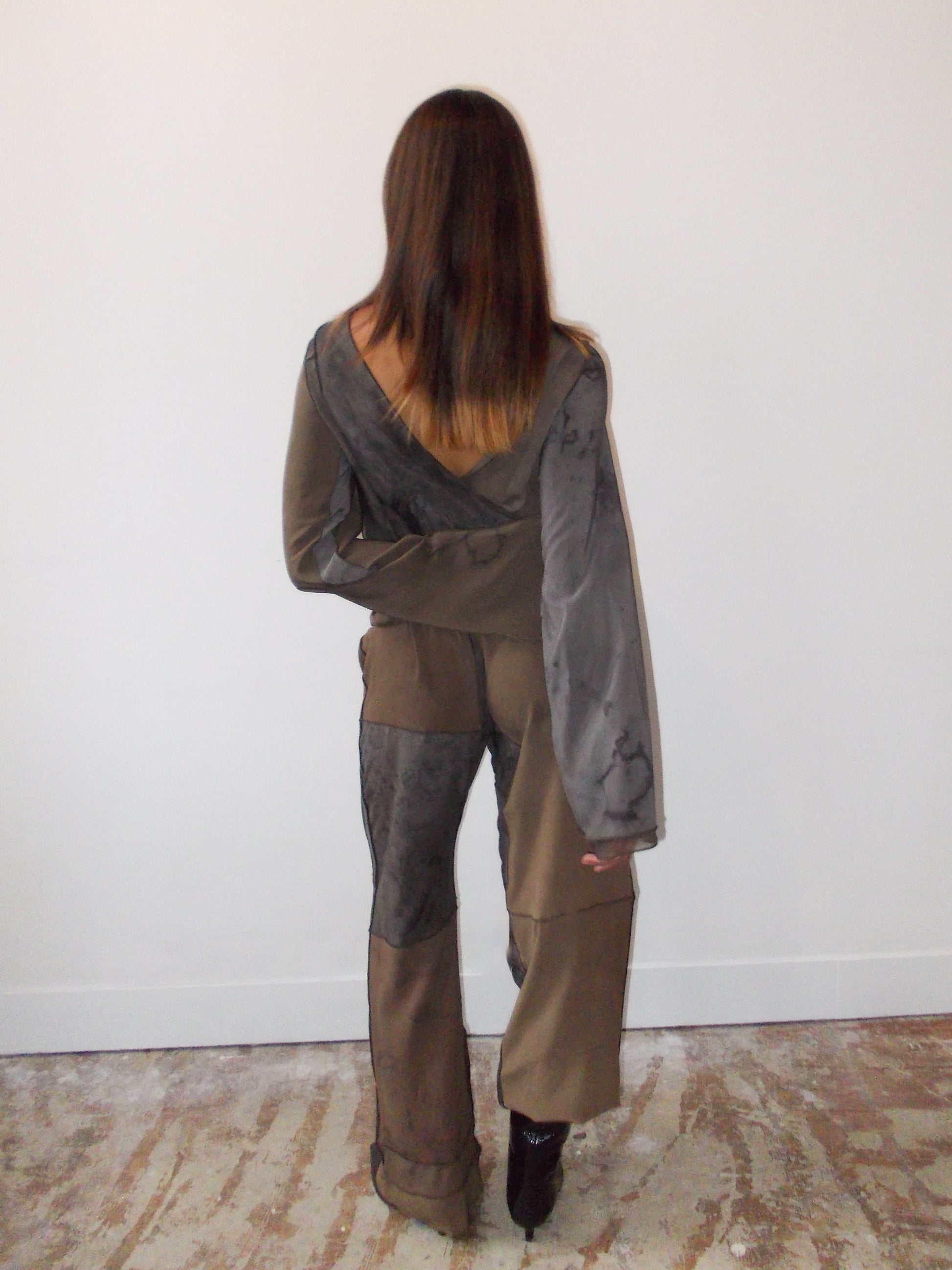 Straight pants made of woven silk crêpe with elasticated waist. Hand dyed in pink, green, brown and yellow hues on a cream base, with a bundle dye technique.