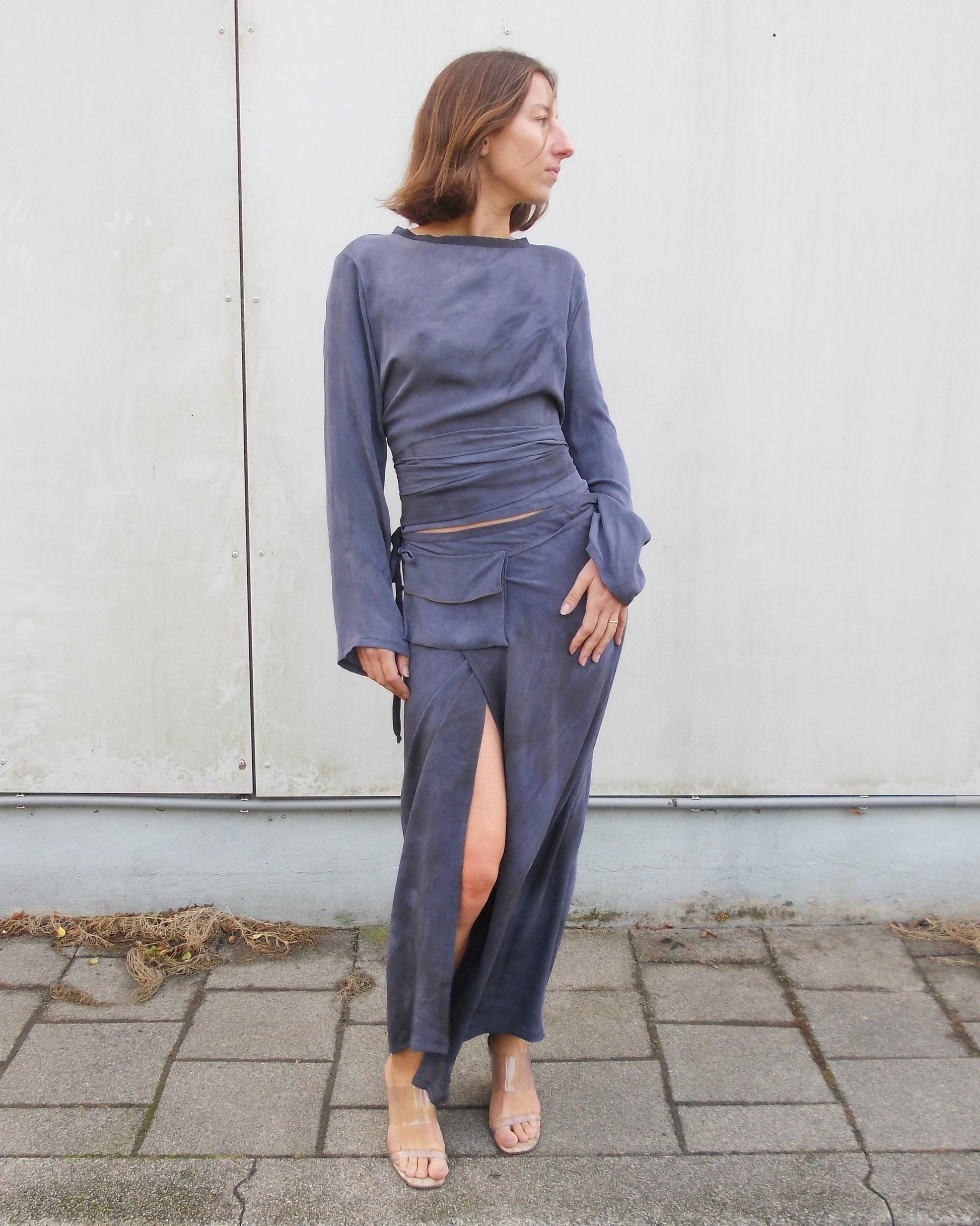 Stunning silk crepe skirt wraps around the waist. The fit is adjustable with wrap construction, offering a dressed, graceful silhouette. Hand-dyed in deep purple tones.