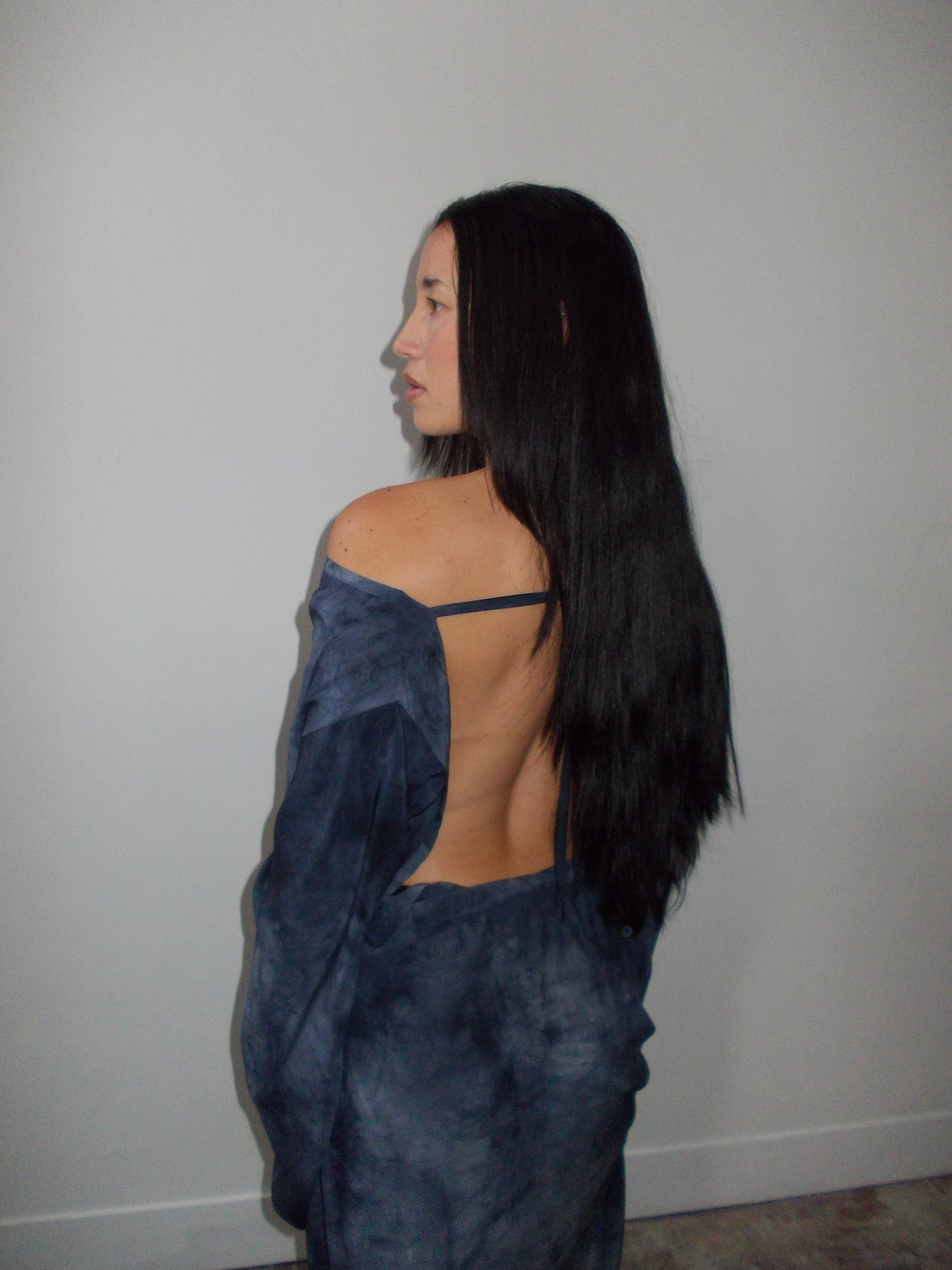 This stunning ankle-length silk dress is crafted from luxurious, soft-flowing silk and naturally dyed in a rich deep-blue tone. Designed with long, elegant sleeves and a beautifully open back, it offers a sophisticated yet sensual silhouette. The open back can be secured with a delicate tie at the shoulders, adding both comfort and subtle detail.
